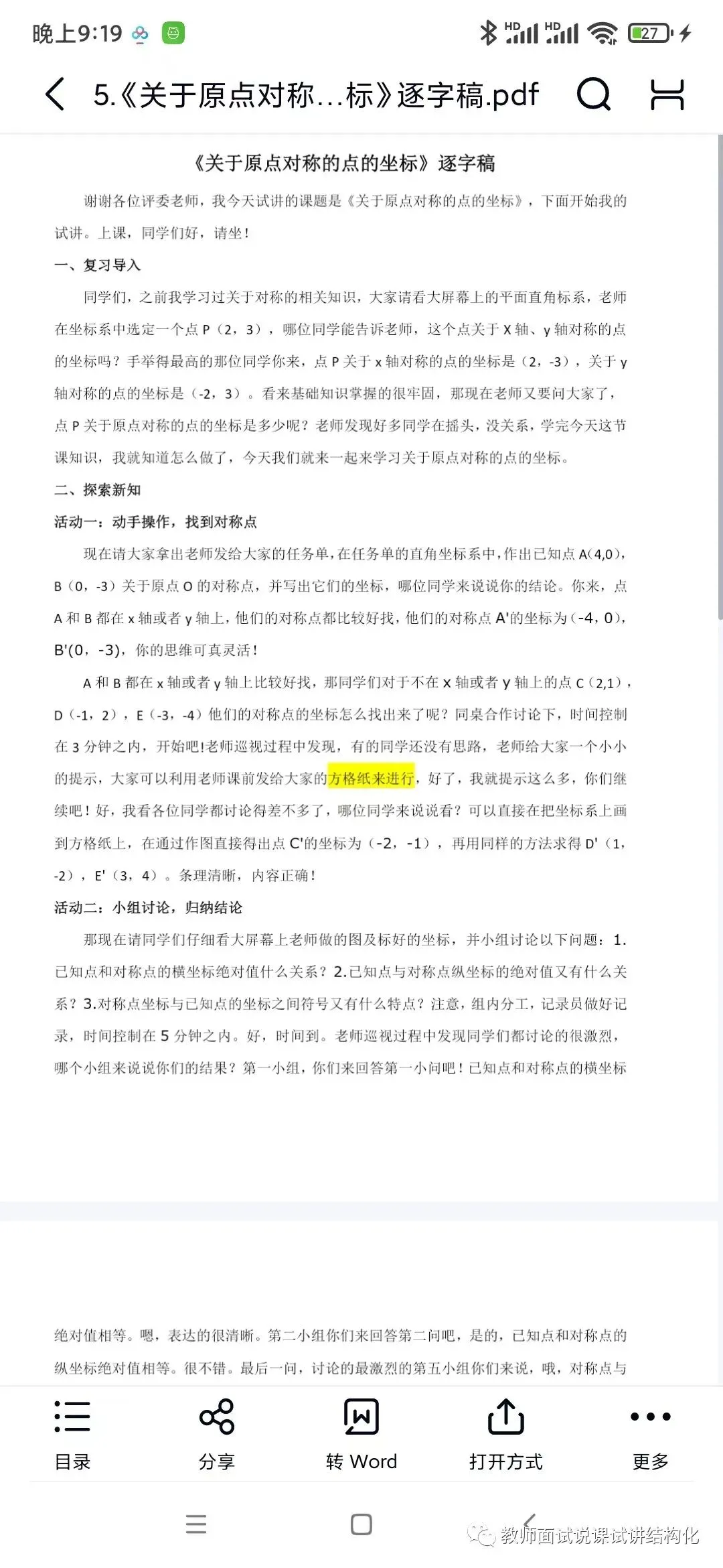 初中数学面试《关于原点对称的点的坐标》题目+教案+试讲稿+答辩