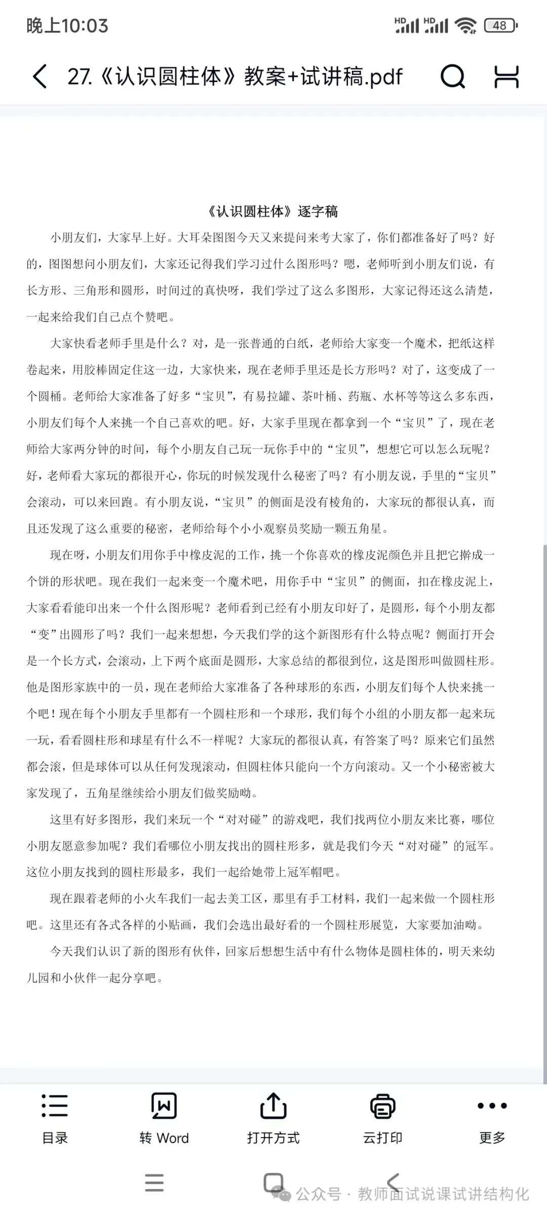 幼儿园《认识圆柱体》试讲逐字稿