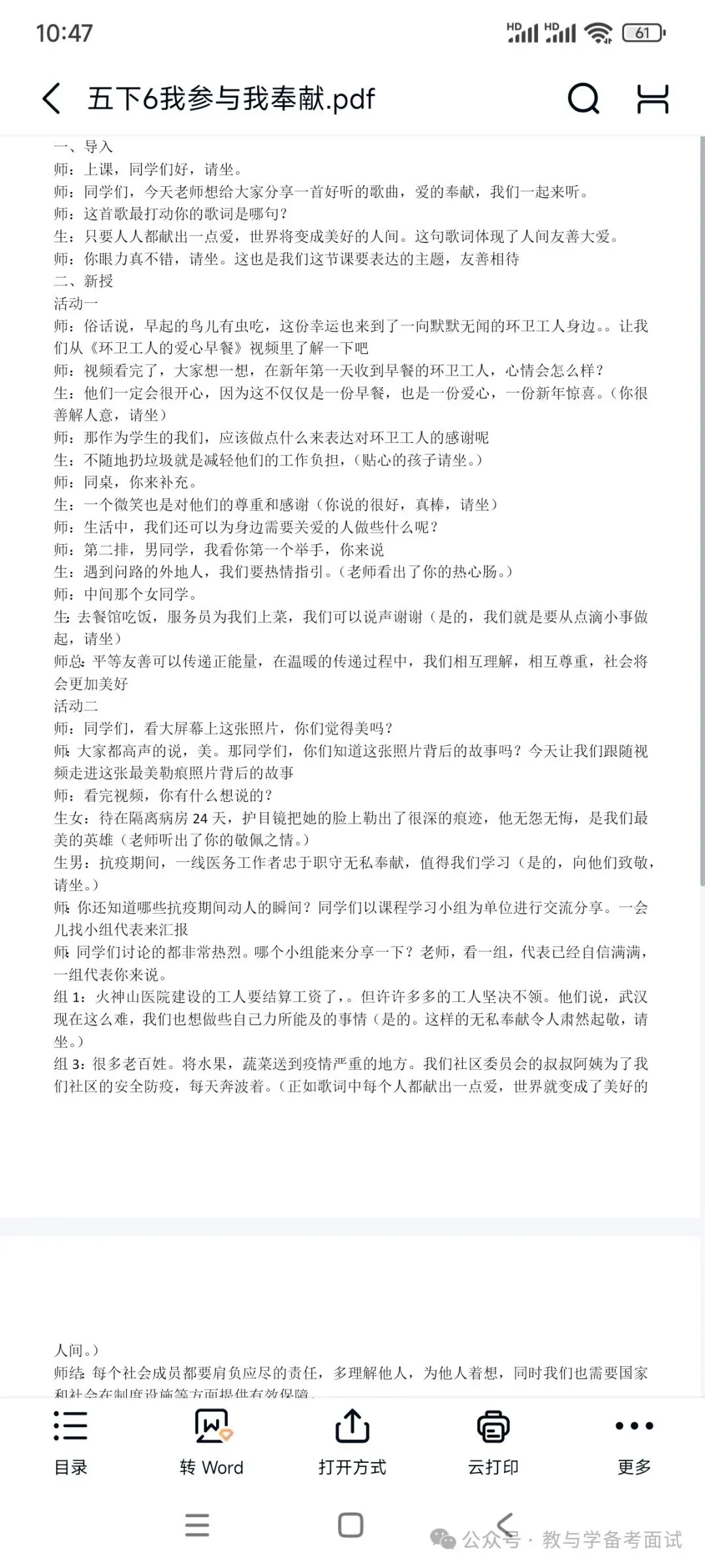 小学道德面试试讲《我参与我奉献》试讲逐字稿