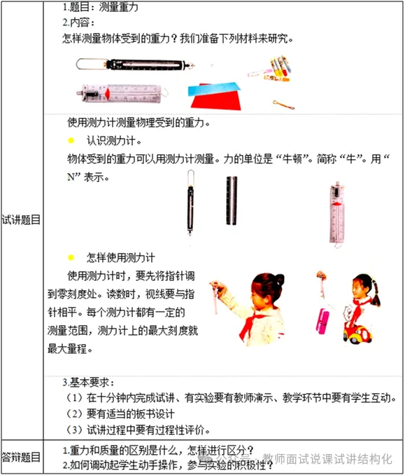 (1)教师指出物体受到的重力可以利用测力计测出,讲解关于力的基本知识:包括力的单位是“牛顿”,简称“牛”,用“N”表示。
