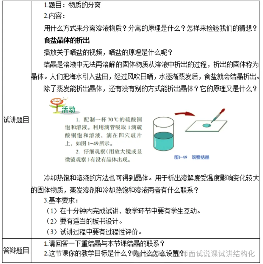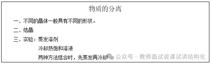 这样设置的原因是首先本节课学习的主要内容是通过结晶来分离物质,并且结晶有两种方法,分别是蒸发溶剂和冷却热饱和溶液,本节课学生需要掌握两种方法的原理和具体操作过程。其次,本节课的学习中,通过学生小组合作操作实验观察结晶过程,加深学生对结晶步骤的理解及提高学生的动手操作能力,更好的体现学生的主体性。最后,本节课的知识点与生活紧密联系,通过让学生结合做实验的方法去学习本节课,能很好的激发学生的学习兴趣,进而提高学生课堂学习的效率。