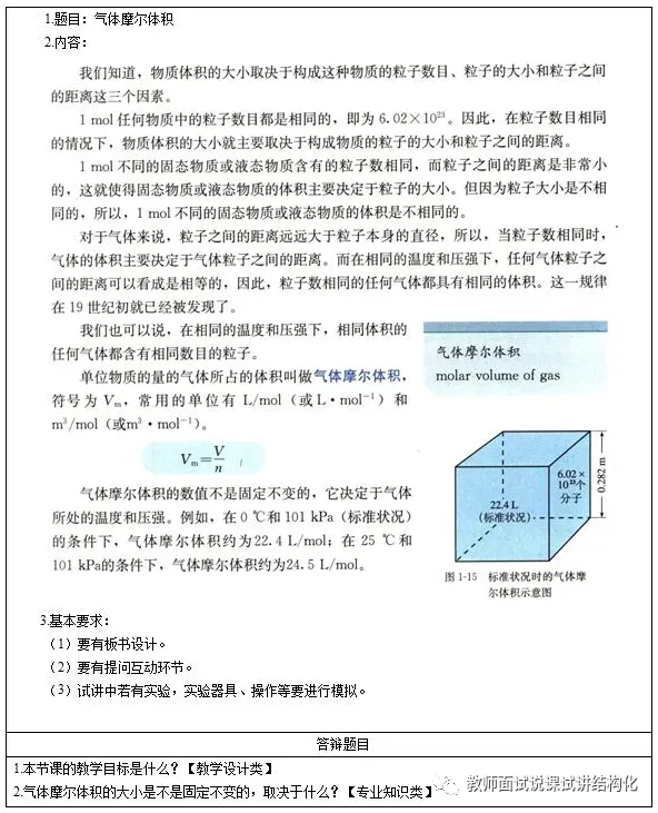 高中化学面试《气体摩尔体积》题目+教案+试讲稿+答辩