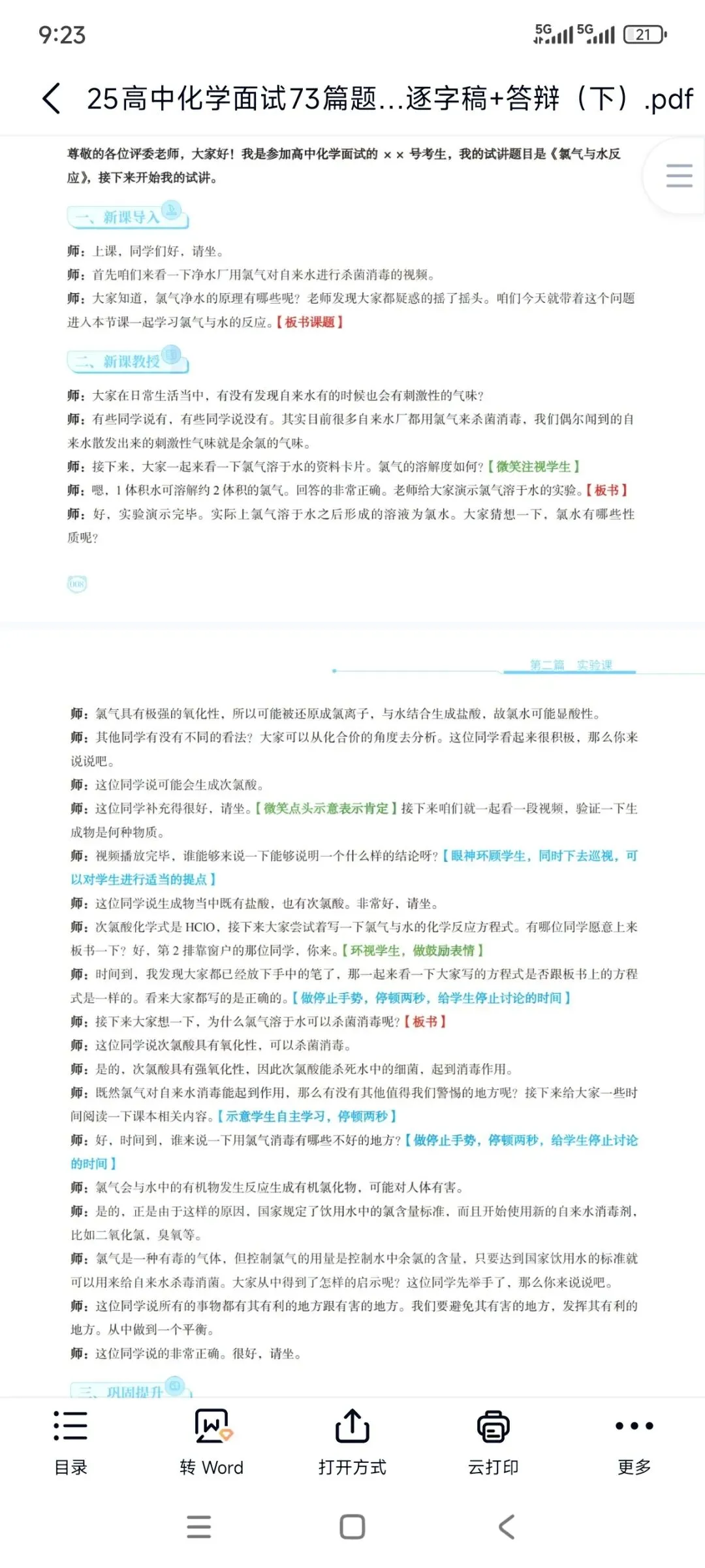 高中化学《氯与水》面试试讲逐字稿