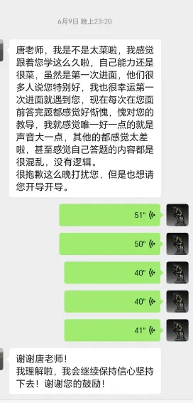 在最后的冲刺阶段,我因为自己太过于焦虑,在6月9号晚上23点20分给唐老师聊了微信,原本以为他面对那么多人,而且那么累,是不会回我信息的。没想到,唐老师不仅第一时间发消息回复我,而且我发一条他发好几条,确实跟唐僧一样,不厌其烦地碎碎念地解答我的问题,一直不停的鼓励我,让我相信自己,不要患得患失,不要陷入自我怀疑。