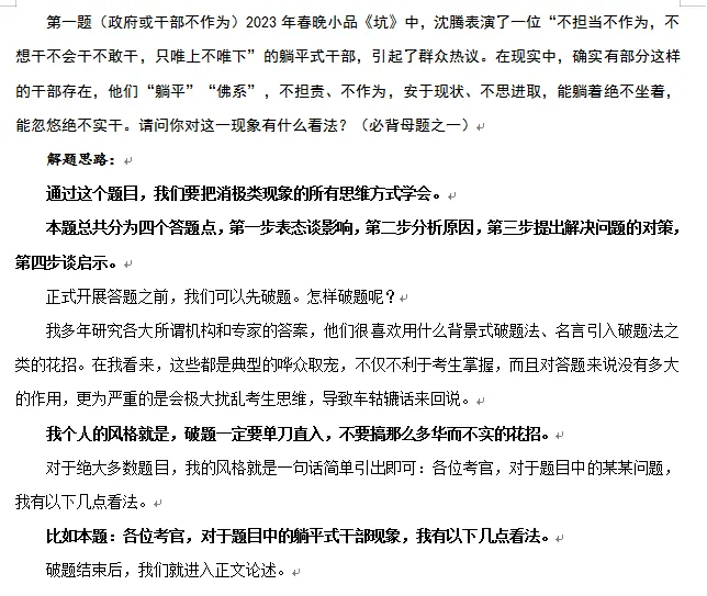 第二题讲的是干得多错的多,有些干部就不想干事情。这不是唐老师《面试的思考》这本书里必背母题的第一道,躺平干部吗?