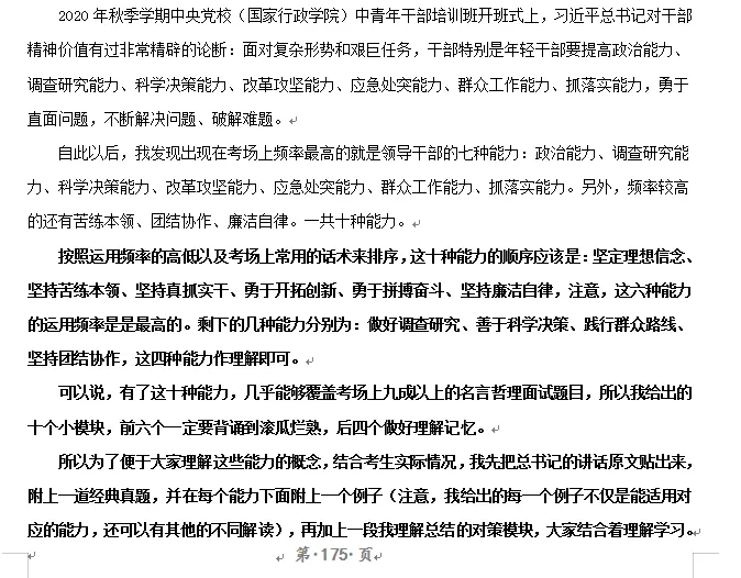 第三题讲的是干部的责任和能力问题,这简直又是唐老师的《面试的思考》这本书里的“干部精神价值类”十个小模块的内容嘛?平时唐老师让我们背诵到滚瓜烂熟,而且考试的头一天晚上我背诵了,当天早上也背诵了,没想到直接用上了,我想,这也是我这次能够逆袭的关键所在。