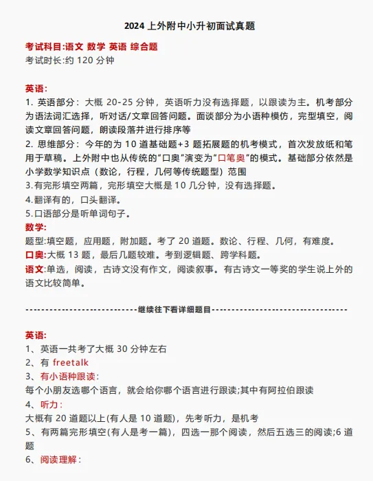 前两天,上海三公学校公布了2026年招生细节,现在报名时间基本上结束,接下来等待初审的时间,可以让孩子做下三公学校历年笔试/机考真题,橙子为大家整理出来了上实、上外附中、浦外三所学校的面试真题和机考题,找橙子领取即可。