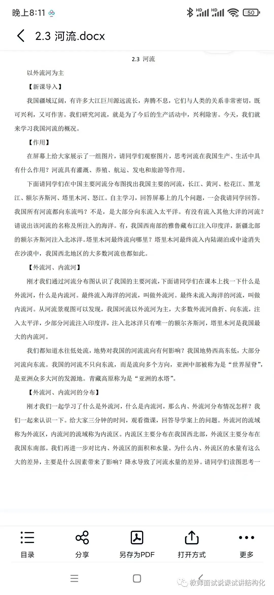 初中地理面试《以外流河为主》题目+教案+试讲稿+答辩