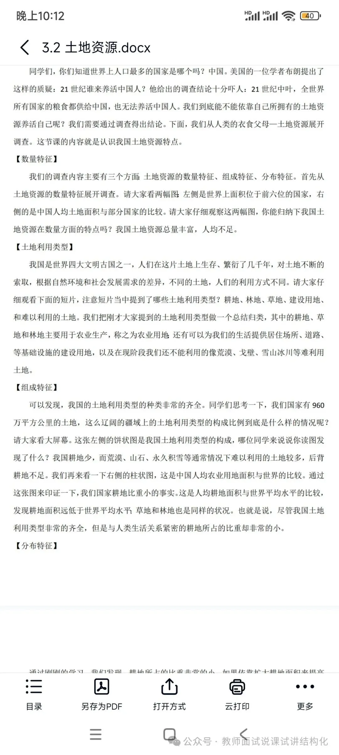 初中地理面试《土地资源一类型齐全,耕地比重小》题目+教案+试讲稿+答辩