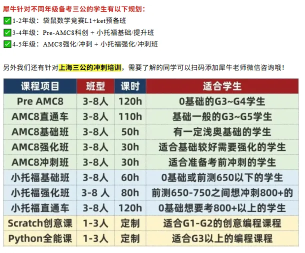 犀牛教育专门针对上海三公备考规划,开设了定制化的课程,不同年级的孩子都可以在犀牛找到适配的课程,AMC8+小托福课程辅导,帮助孩子数学+英语两手抓,高分稳稳拿下!