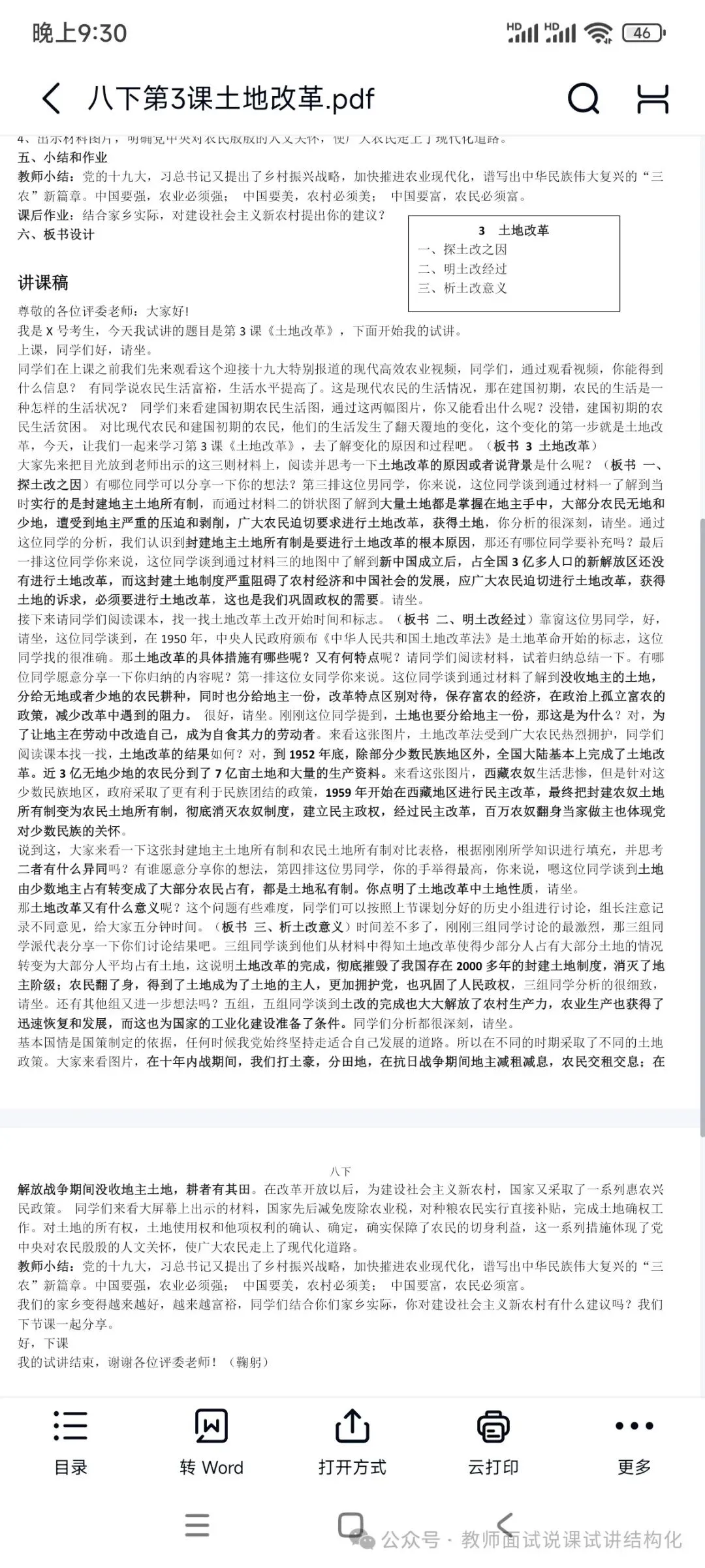 初中历史面试试讲《土地改革》逐字稿