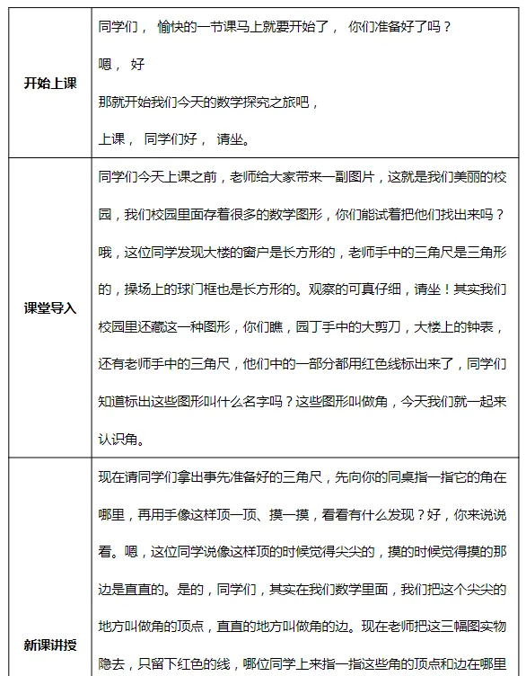 同学们, 愉快的一节课马上就要开始了, 你们准备好了吗?同学们今天上课之前,老师给大家带来一副图片,这就是我们美丽的校园,我们校园里面存着很多的数学图形,你们能试着把他们找出来吗?哦,这位同学发现大楼的窗户是长方形的,老师手中的三角尺是三角形的,操场上的球门框也是长方形的。观察的可真仔细,请坐!其实我们校园里还藏这一种图形,你们瞧,园丁手中的大剪刀,大楼上的钟表,还有老师手中的三角尺,他们中的一部分都用红色线标出来了,同学们知道标出这些图形叫什么名字吗?这些图形叫做角,今天我们就一起来认识角。现在请同学们拿出事先准备好的三角尺,先向你的同桌指一指它的角在哪里,再用手像这样顶一顶、摸一摸,看看有什么发现?好,你来说说看。嗯,这位同学说像这样顶的时候觉得尖尖的,摸的时候觉得摸的那边是直直的。是的,同学们,其实在我们数学里面,我们把这个尖尖的地方叫做角的顶点,直直的地方叫做角的边。现在老师把这三幅图实物隐去,只留下红色的线,哪位同学上来指一指这些角的顶点和边在哪里吧。戴眼镜的男生,你来吧!他指的对吗?是的,完全正确!那下面请同学们数一数“一个角有几个顶点?有几条边呢?”一起大声告诉老师吧!对的,一个角有一个顶点和两条边。接下来,请同学们再拿出事先准备好的彩纸,下面请同学动手,动手折一折,折出一个角吧!时间控制在 3 分钟之内,开始吧!嗯,老师刚才在巡视的过程中发现大部分同学都已经做好了,做的还都很好看。现在老师有个问题“怎么样可以知道你和同桌做的角,谁的大,谁的小呢?”。好,手举得最快的这位同学,你来说!嗯,这位同学说,把两个角的像她演示那样叠在一起,比一比就知道了。你们的思维可真灵活!刚才大家做角的时候老师也做了 2 个角,而且老师做的角是可以变身的。大家仔细看哦!现在老师把这个角打开,角就变。。。对,变大了;再往里合拢,就变。。。小了。所以,哪位同学来跟大家说一说“角的大小跟什么有关系呢?”课代表你来说,嗯,是的,跟两条边打开的大小程度有关。总结非常到位!现在老师把这个角的大小固定,贴到黑板上,另一个活动角也固定成一个大小同样的角,大家仔细看,老师用剪刀把这个角的一条边剪短一点,再跟黑板上这个角比一比看,这个角的大小变化了吗?是的,没有,再把另一条边也剪短一点,再比一下,大小变了吗?也没有!所以,角的大小跟边的长短有关系吗?一起大声告诉老师!我们一起来结合前面得出的结论,角的大小跟什么有关跟什么无关呢?班长你来说吧!角的大小跟两条边打开的程度有关,跟边的长短无关!内容正确,语言精练!现在我们认识了角也知道了角的大小了,下面请同学们,动手画一个角吧!好,老师看同学们都画好了,哪位同学来当小老师,告诉大家怎么画角?你上课听讲好认真,你来吧!嗯这位同学说,从一个点起,用尺子向不同的方向画两条笔直的线。嗯,这位小老师演示的既生动又正确。同学们一定要注意向不同的方向画线哦!都学会了吗?都学会了啊,老师真为你们感到骄傲!第一关:判一判,请大家判断一下上面这些图形,哪些是角,哪些不是角,为什么?你来,第一个不是角,因为顶点那里是弧形,第二个也不是,有一条边不是直直的,第三个是角。完全正确,请坐!第二关:数一数,上面这些图形有几个角?你来说,第一个四个角,第二个三个角,第三个图形是五个角。你们可真是火眼精金!好了,愉快的一节课马上就要结束了,哪位同学来分享一下你这节课有什么收获吧!你来,认识角并且知道画角和比较角的大小。你再来,今天我们好多都是思考并结合动手发现的,所以觉得学习数学要乐于思考,勤于动手。看来大家收获不小啊,老师真为你们感到开心!下面,请同学们回家找一找我们生活中又哪些角?下课来和同学们交流分享。超优惠面试资料,添加老师微信!