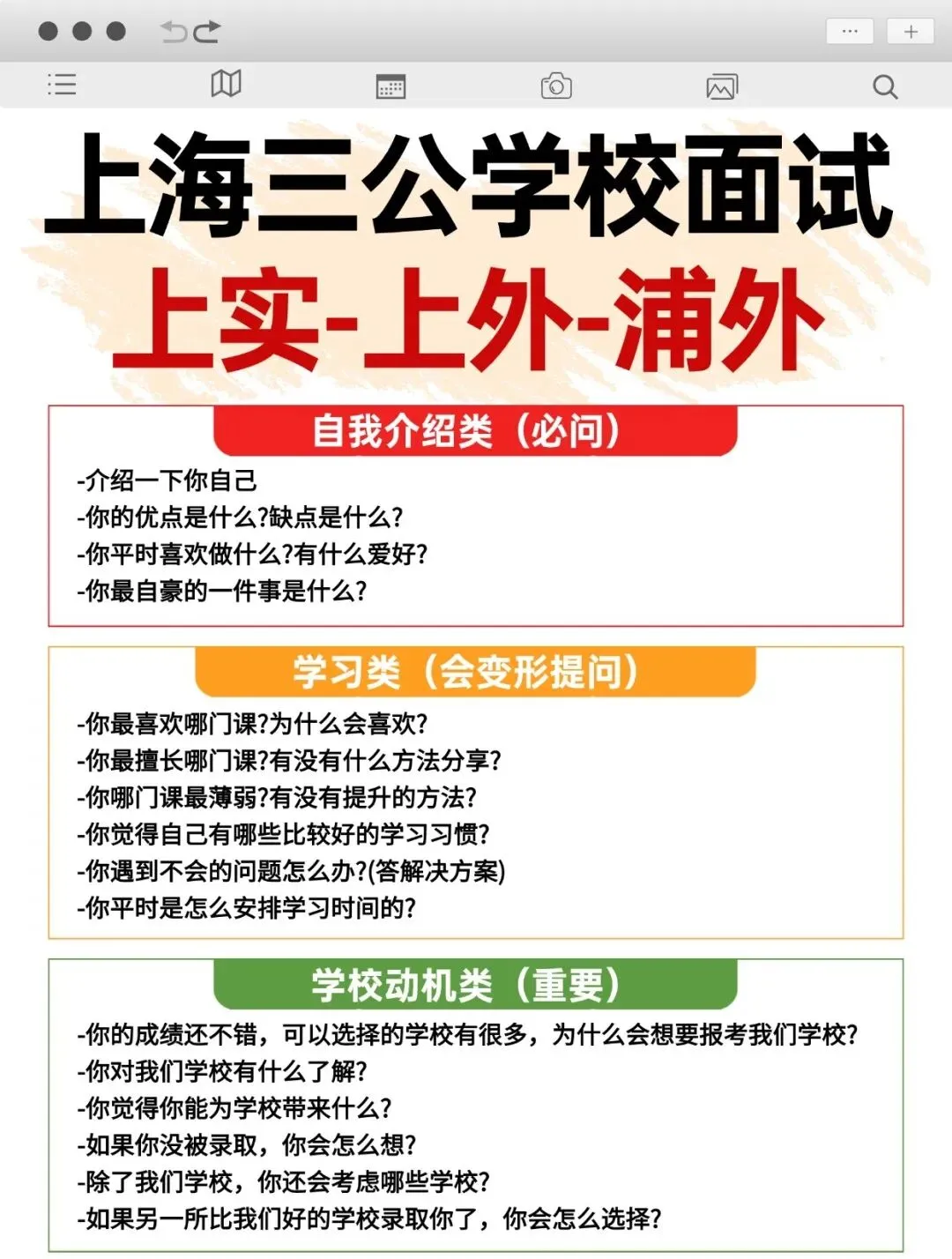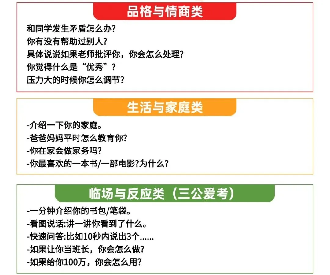 小编汇总了历年三公学校面试的常考问题,参加面试的同学,这些问题大概率都会涉及到,务必要码住,提前准备相关答案!