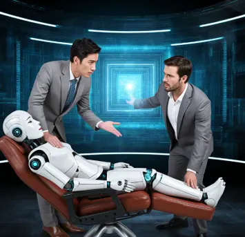 (漫画)画的是几把椅子,一个A机器人躺在椅子上,然后两个人紧张地冒汗。那些人紧张AI机器人会取代他们的工作岗位吗?