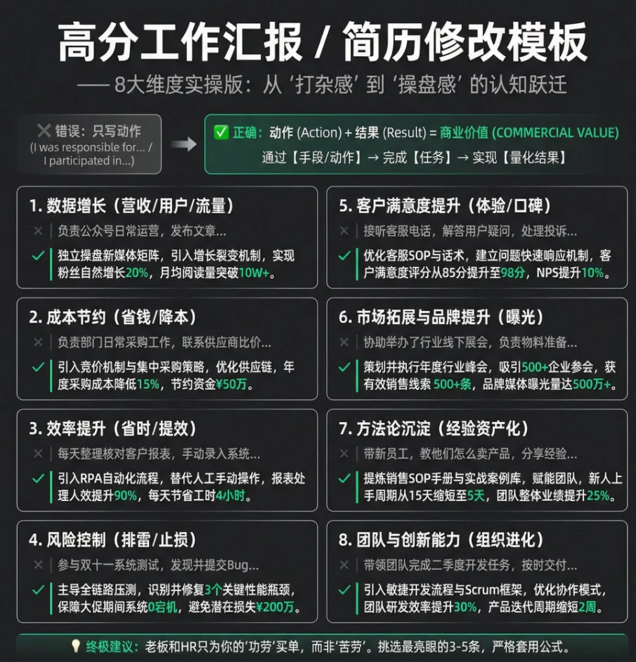 💡 终极建议:在写周报、晋升答辩或改简历时,挑出你最亮眼的 3-5 条,严格套用上述句式。记住:老板和HR没有时间看你的“苦劳”,他们只为你的“功劳”买单。
