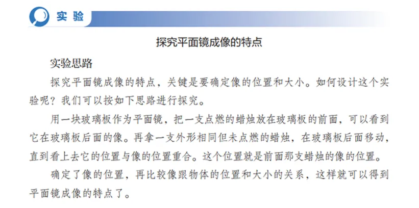 (2)教师提示学生需要哪些实验器材:平面镜、玻璃板、蜡烛(两根完全一样的),并追问为什么要用玻璃板?学生回答:玻璃板也可以反射光线。教师补充:不仅如此,还可以透过玻璃板看到另一面的蜡烛与像,方便对比。
