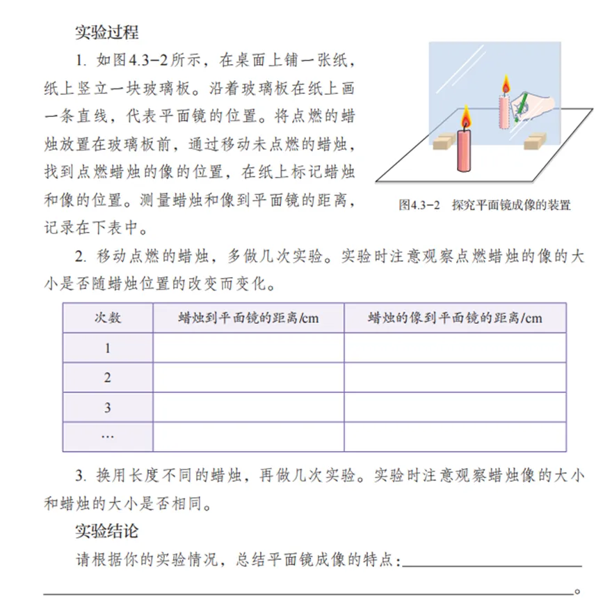在桌面上铺一张大纸,纸上竖立一块玻璃板作为平面镜。沿着玻璃板在纸上画一条直线,代表平面镜的位置。把一支点燃的蜡烛放在玻璃板的前面,可以看到它在玻璃板后面的像。再拿一支外形相同但不点燃的蜡烛,竖立着在玻璃板后面移动,直到看上去它跟前面那支蜡烛的像完全重合。这个位置就是前面那支蜡烛的像的位置。在纸上记下这两个位置。实验时注意观察蜡烛的大小和它的像的大小是否相同。