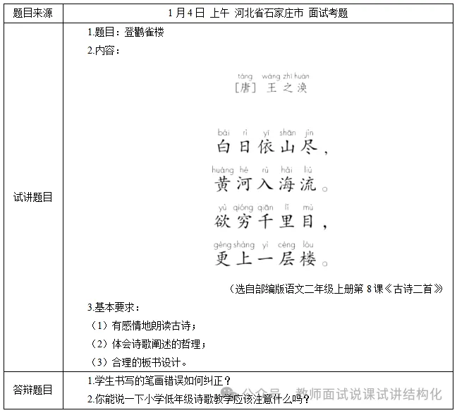 小学语文面试《登鹳雀楼》试讲真题+解析+答辩