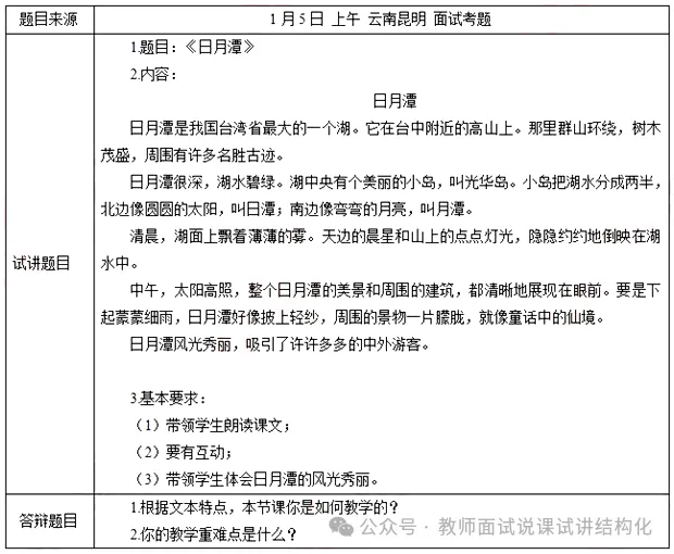 小学语文面试《日月潭》试讲真题+解析+答辩