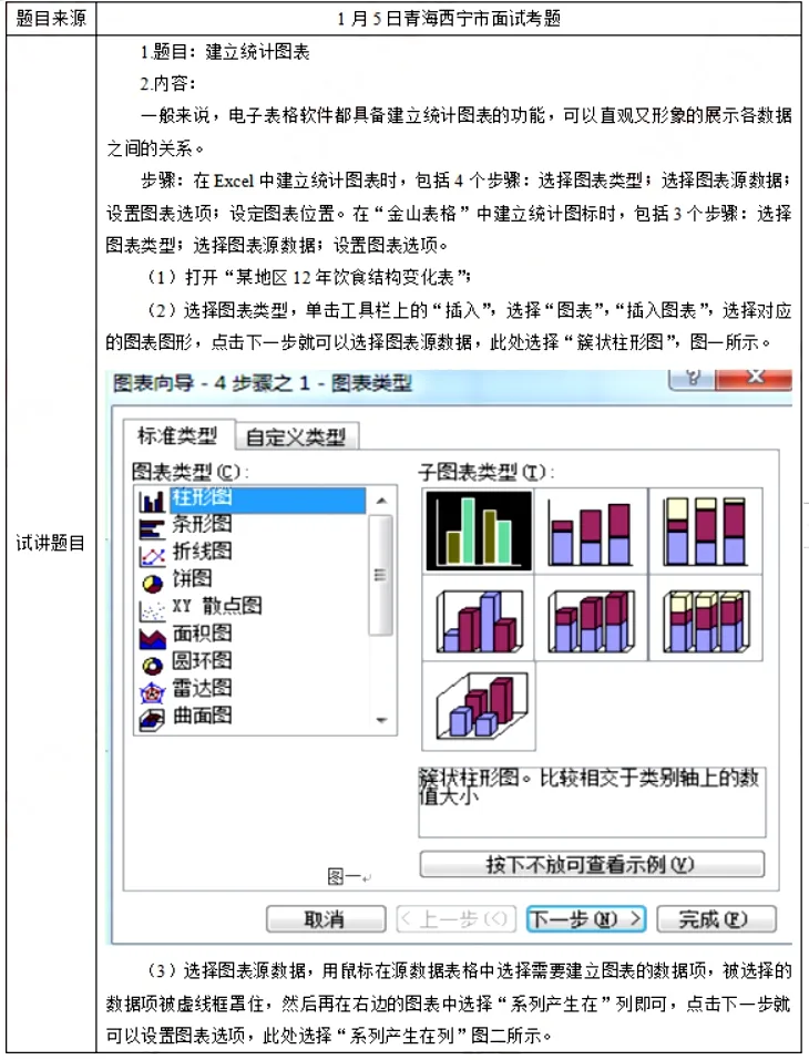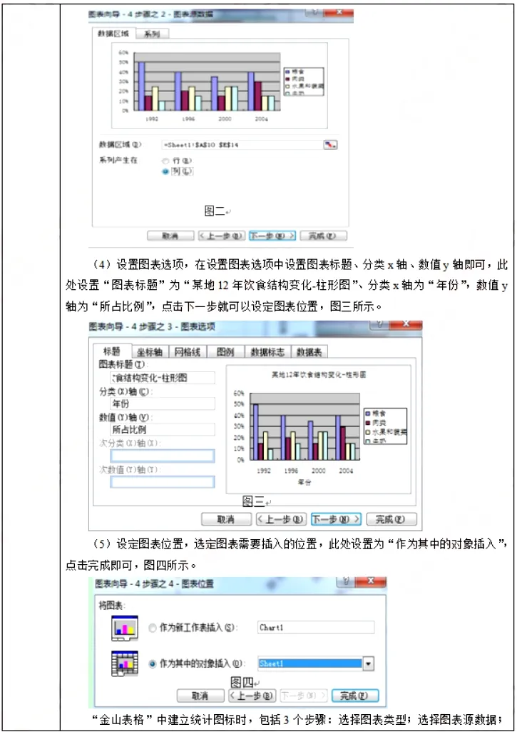 插入→图表→4步骤之一【选择图表类型】→4步骤之二【选择图表源数据】,并且在这个步骤确定系列产生在行或者列→4步骤之三【设置图表选项】,如图表标题、分类X轴、数值Y轴→4步骤之四【选择图表位置】,默认作为对象插入当前表格,点击完成就会在当前表格插入一张图表。