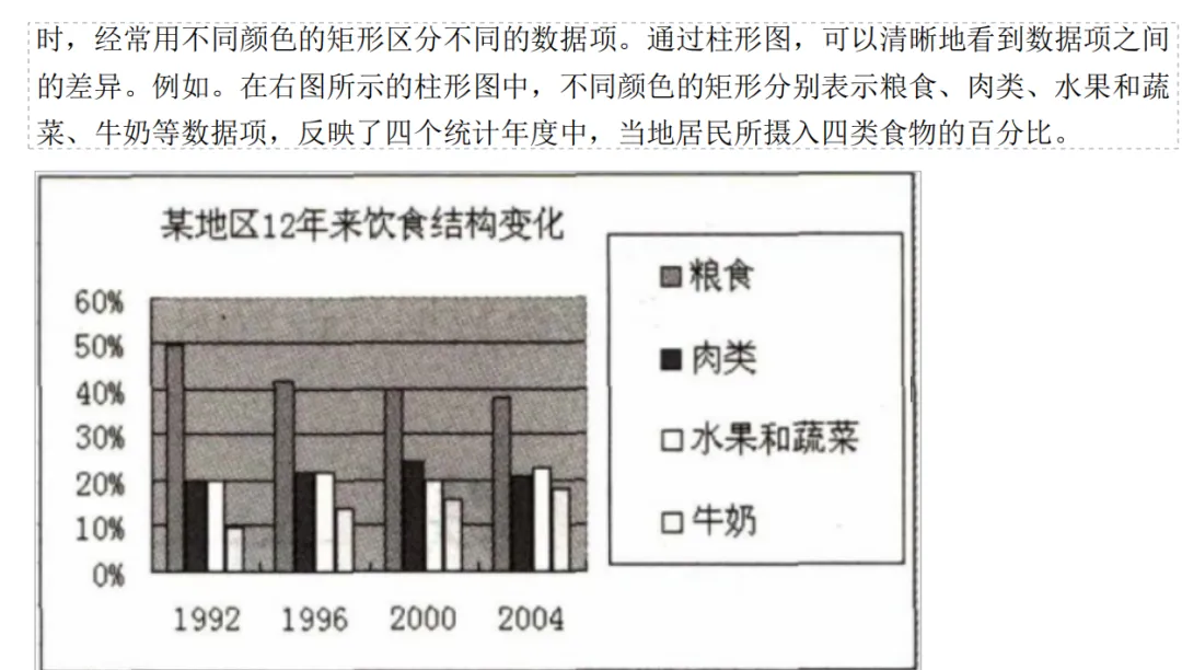 明确本节课的任务,根据“某地区12年的饮食结构变化”表格建立三种图表:柱形图、条形图、折线图。