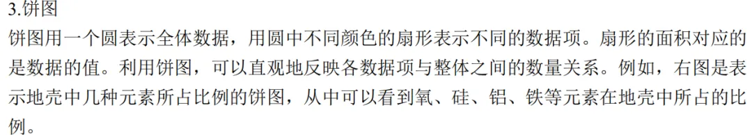 教师进行总结:饼图用一个圆表示全体数据,用圆中不同颜色的扇形表示不同的数据项。扇形的面积对应的是数据的值。利用饼图,可以直观地反映各数据项与整体之间的数量关系。