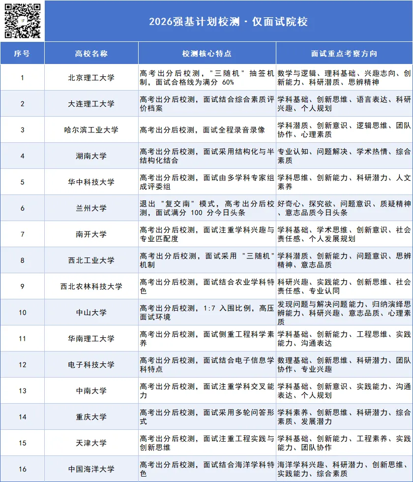 2026 年强基计划招生简章已全部公布,不少考生和家长都想避开笔试压力,专攻面试院校。这份整理好的干货,直接收藏备考!