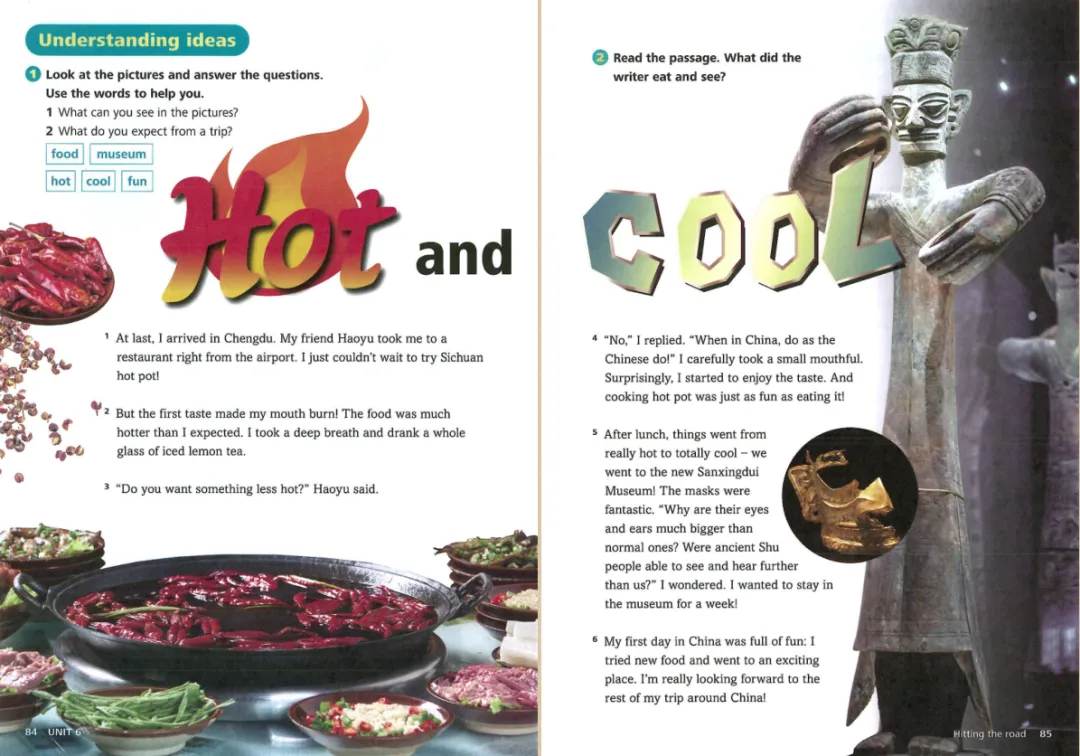 从教师自己的夏季Vlog重庆旅行中展示图片重庆火锅,谈论食物的味道,问学生:How do you feel?引出:hot, hot, hot! 再展示博物馆的冷色调图片 Bronze Statue,引出:Cold, cold, cold的feeling, 由此进入文本。