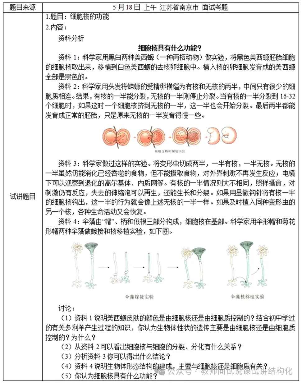 高中生物面试《细胞核的功能》试讲真题+解析+答辩