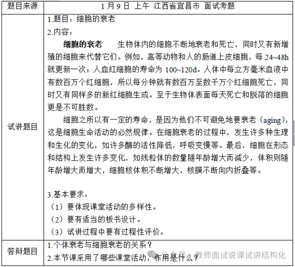 高中生物面试《细胞的衰老》试讲真题+解析+答辩