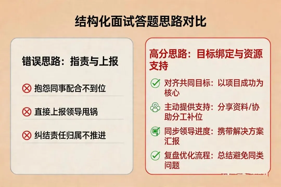 对方消极,另一个原因往往是畏难或怕担责。成年人都有自尊,他不会承认自己不会,只会用拖延来逃避。这时候你的任务是:不动声色地把烂路替他趟平,把好路留给他走。不要说“我来帮你做”,这是施舍,伤人自尊。要说“这块离了你真不行”,这是求助,给人面子。具体话术拆解:“王哥,我昨天梳理进度发现,前面基础数据的清洗校验工作量极大,而且最容易出纰漏(指出客观困难,给台阶)。这块我没您熟悉业务口的情况,万一弄错了还得返工(示弱)。要不这么着,后面那个复杂的算法模型和可视化图表我来熬夜死磕,您受累帮我盯着点原始数据的真实性和口径统一?这是报告的根,根要是歪了,后面我再怎么写花活都是白搭,这一关必须得您来守。”考生启发:这一步的精髓在于责任切割的艺术。你把最苦最累、需要技术的核心部分自己扛了,把相对简单但听起来很重要的“把关权”给了对方。他在舒服区里动了手,还有了参与感和荣誉感,项目自然就推下去了。考官看到的是你极其成熟的领导力雏形。(结构化面试高分答题思维导图)第三步:利益共享——在汇报时做个“会分蛋糕”的人