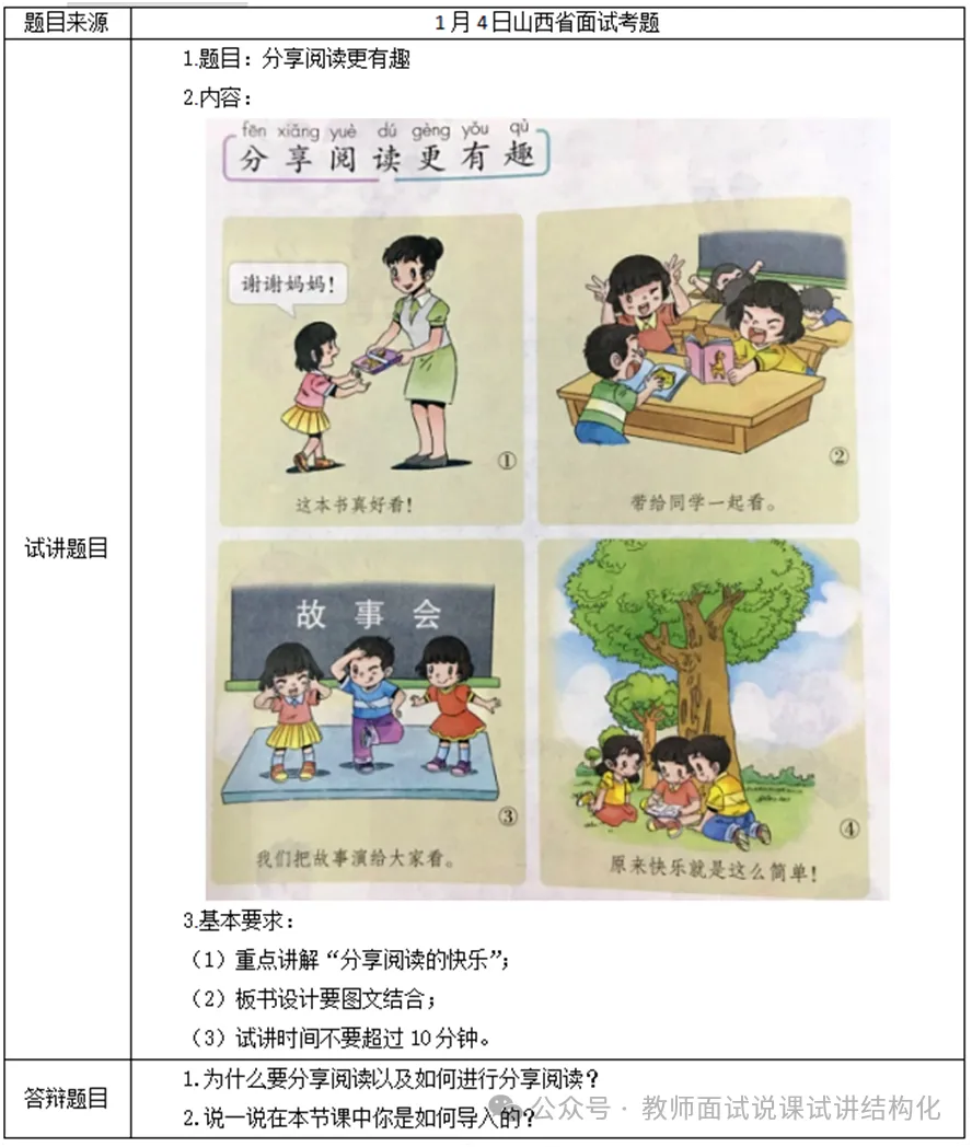 同桌间讨论,然后举手回答。教师总结:阅读分享可以通过将书籍带来学校一起共同阅读,或者通过自己的转述将自己看过的书籍绘声绘色的转述给同学,以及还可以通过表演的方式将书籍的内容表现出来,甚至可以将书放在图书角供大家借阅。