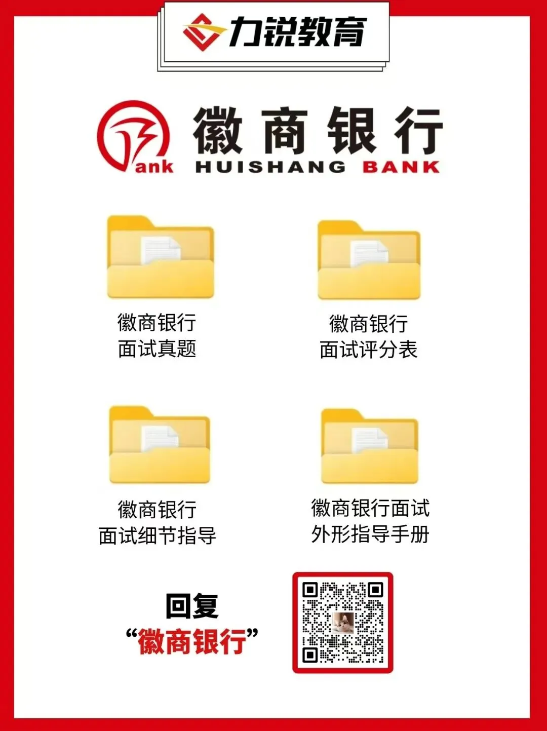 力锐教育整理了徽商银行面试真题,免费分享帮你摸清出题套路,提前模拟演练,从容应对考场,面试拿高分。扫码添加力锐老师回复【徽商银行】即可领取面试资料,力锐助你一战上岸,圆梦银行❤️