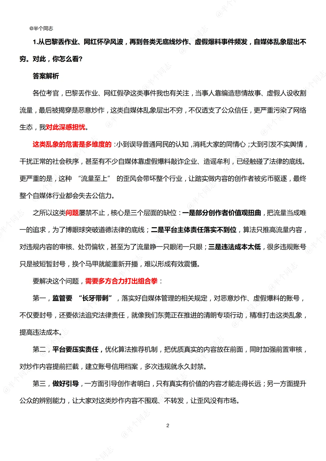 1.从巴黎丢作业、网红怀孕风波,再到各类无底线炒作、虚假爆料事件频发,自媒体乱象层出不穷。对此,你怎么看?