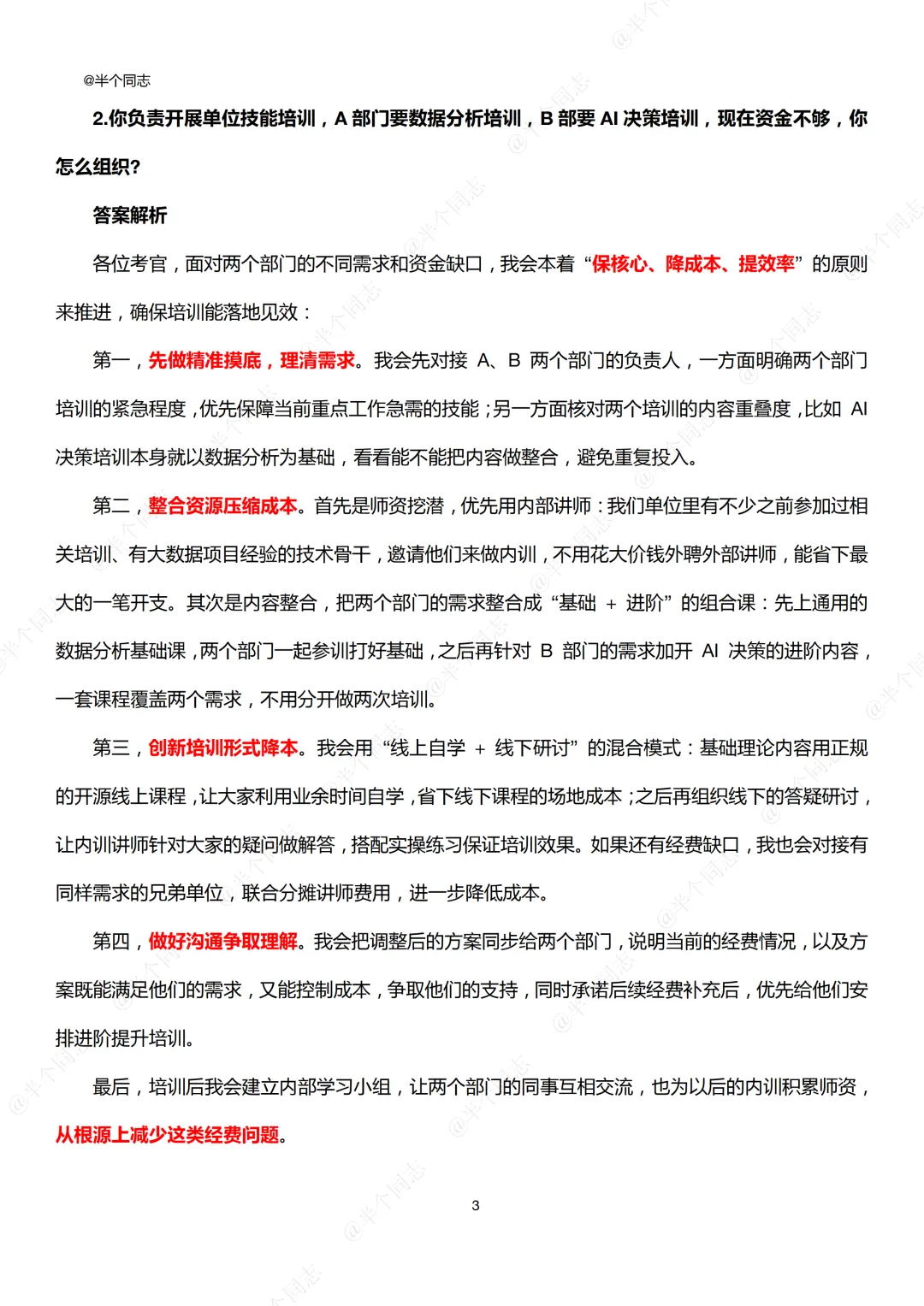 2.你负责开展单位技能培训,A部门要数据分析培训,B部要AI决策培训,现在资金不够,你怎么组织?