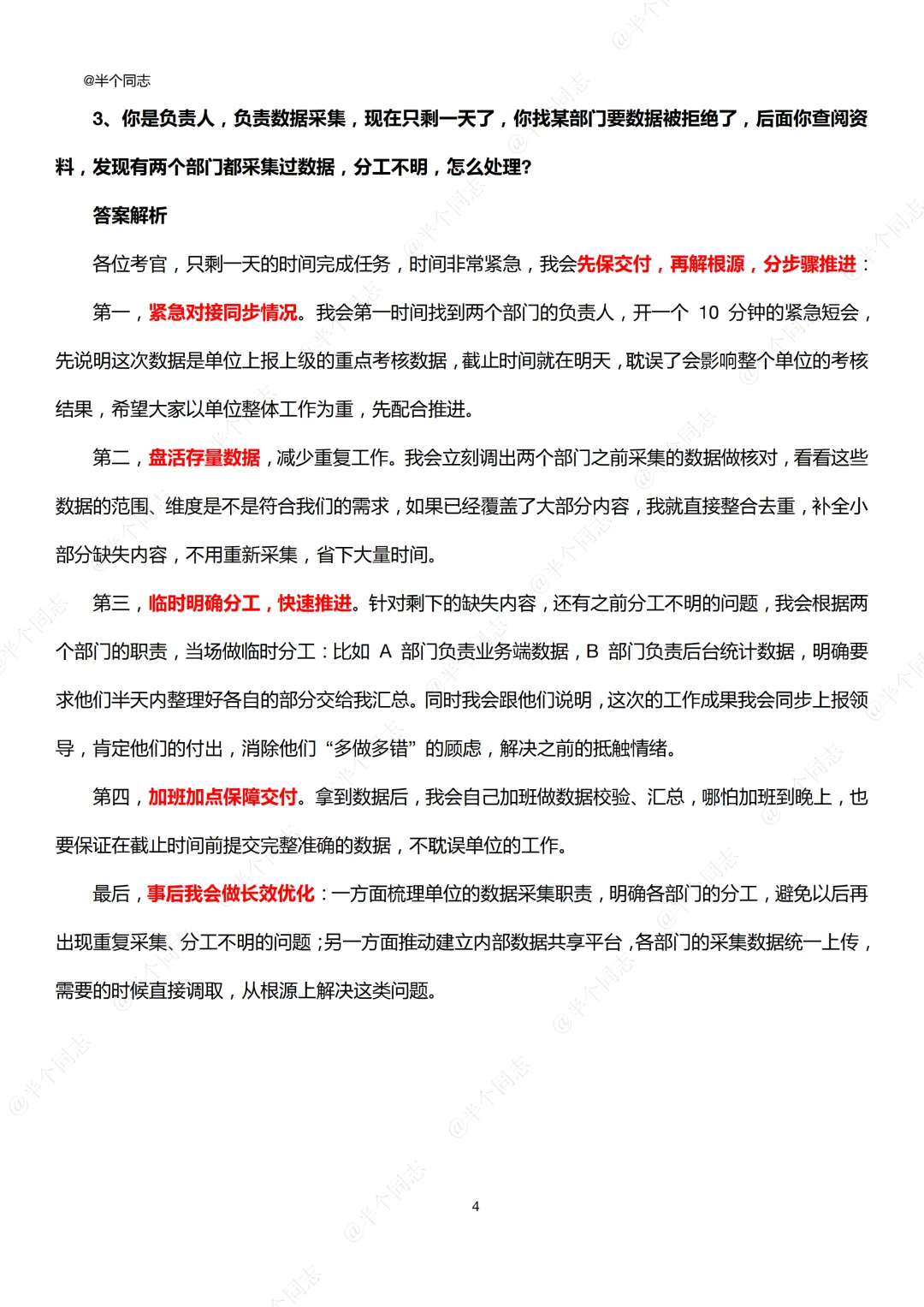 3.你是负责人,负责数据采集,现在只剩一天了,你找某部门要数据被拒绝了,后面你查阅资料,发现有两个部门都采集过数据,分工不明,怎么处理?