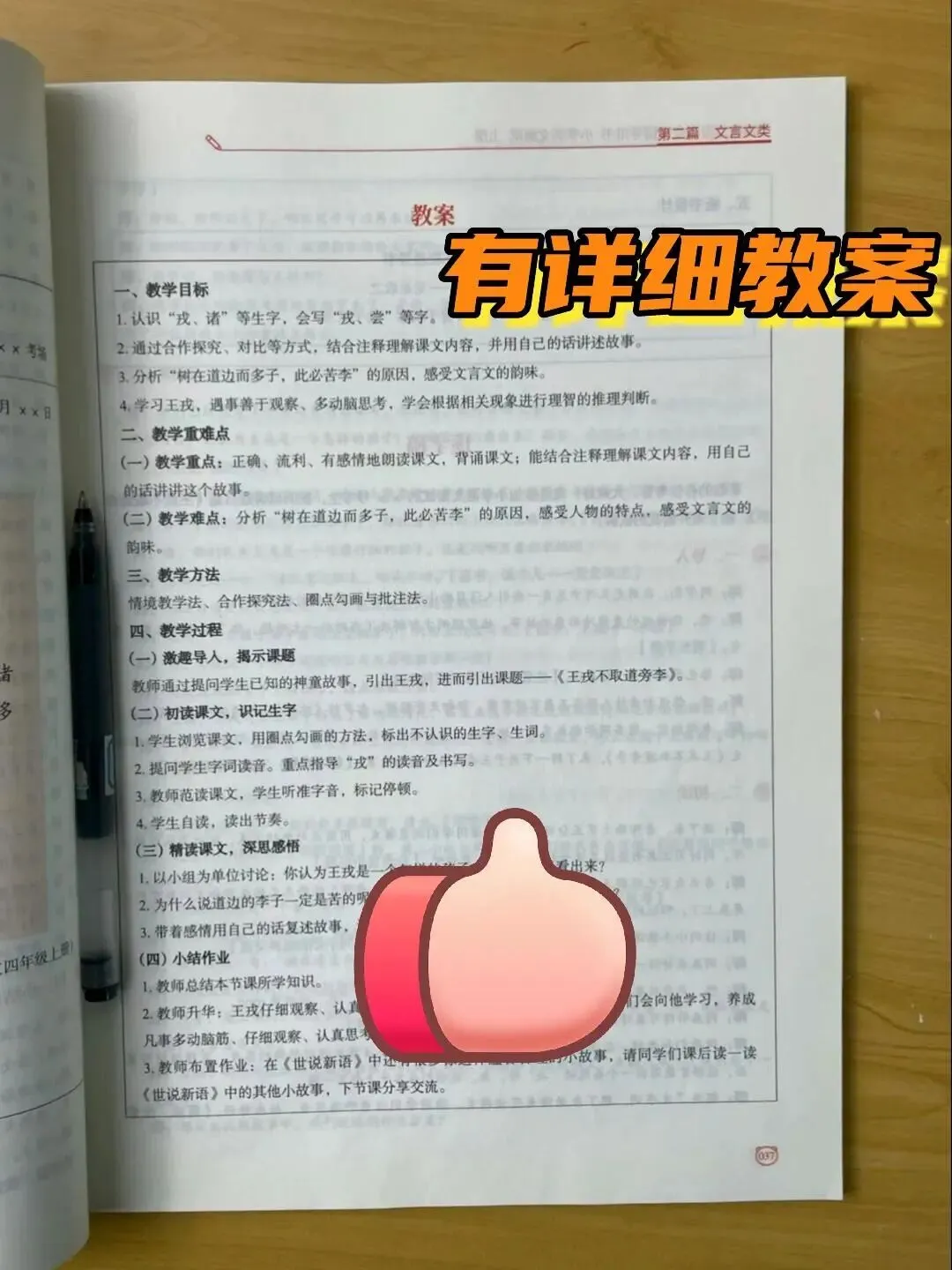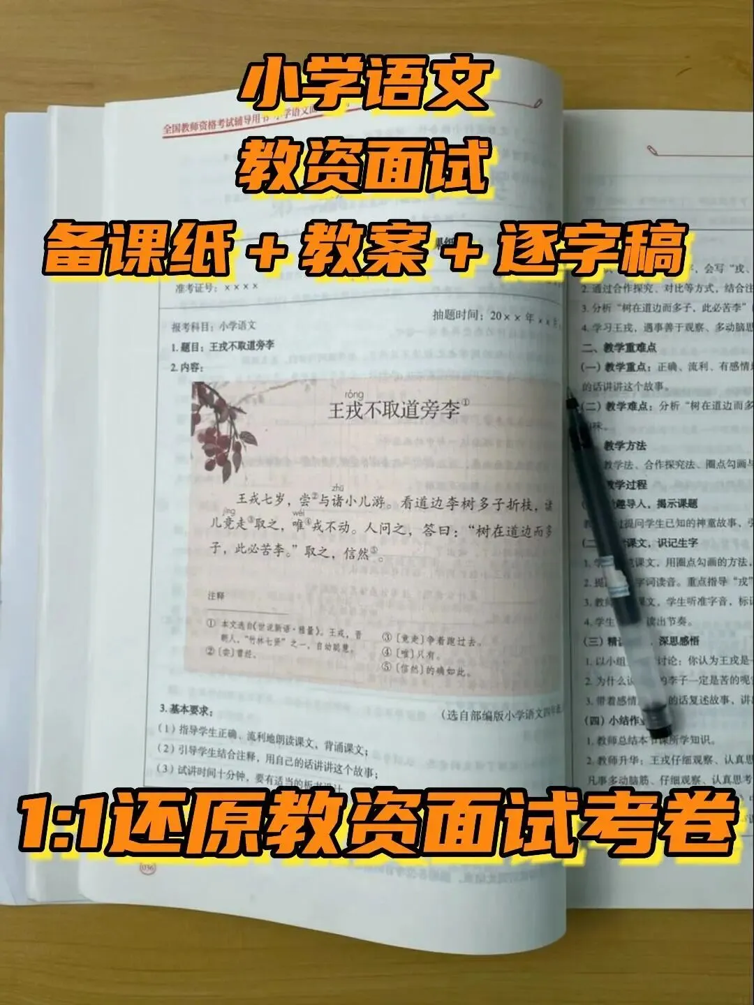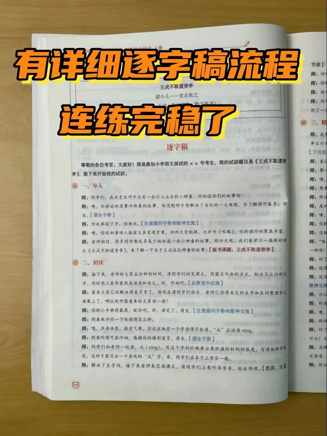 以《王戎不取道旁李》为例,从导入、初读、精读到小结作业,每一步都有详细逐字稿和教案模板,连板书设计都帮你规划好了!“诸小儿——竞走取之,王戎——不动(善于观察 勤于思考)”,逻辑清晰,重点突出,试讲十分钟轻松驾驭。