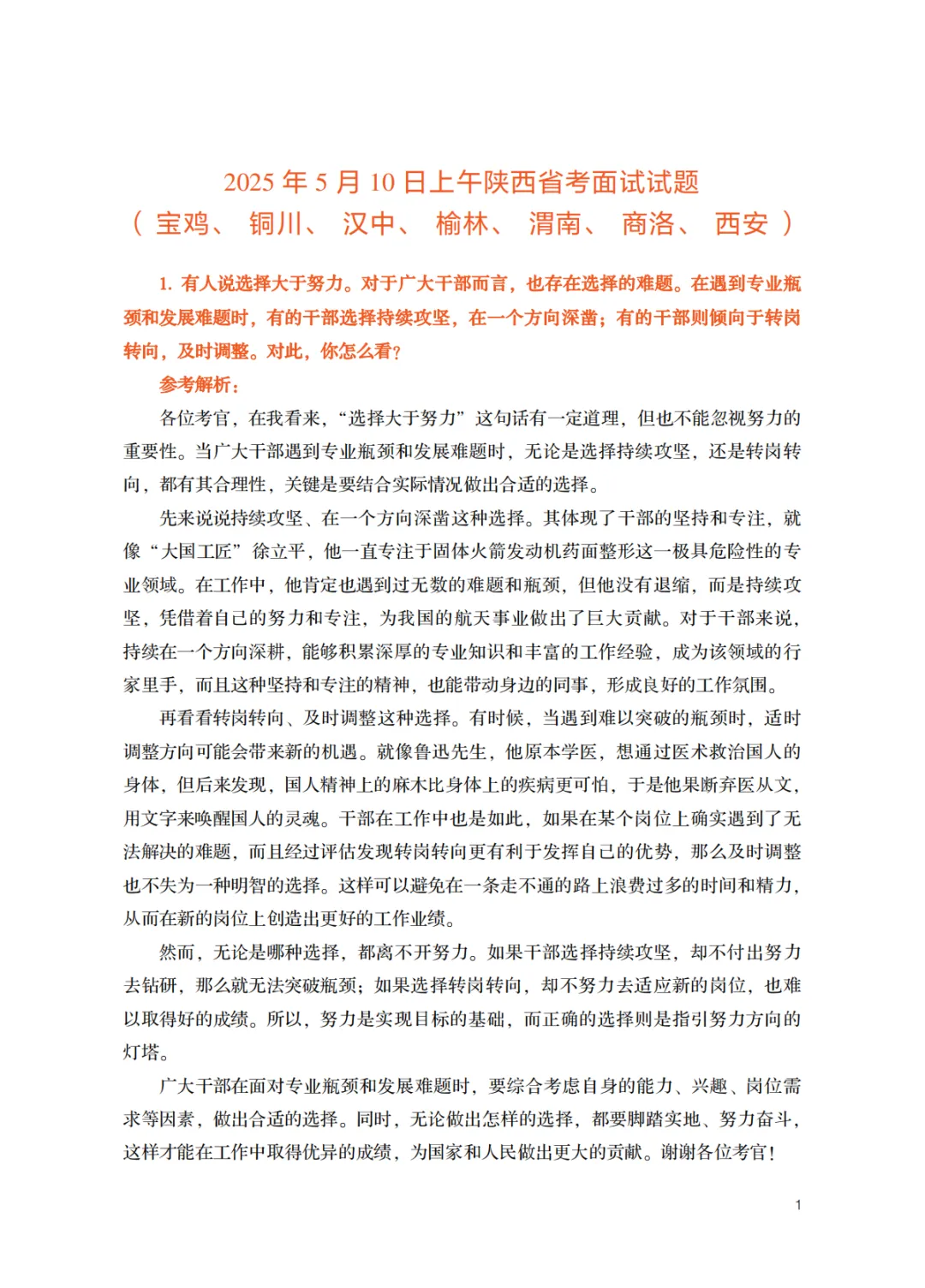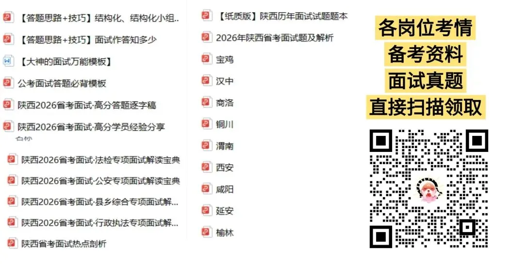 今天图图直接给大家放大招!整理了2024-2025 年陕西省考全岗位面试真题合集,覆盖综合岗、公检法、省直系统,每一道题都附了考官级参考解析和高分答题示范,帮你精准踩中得分要点!