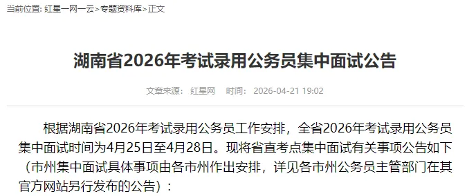 面试时间:2026年4月25日—4月28日(省直及长沙考区4月25日-28日,其他市州4月25日-27日)