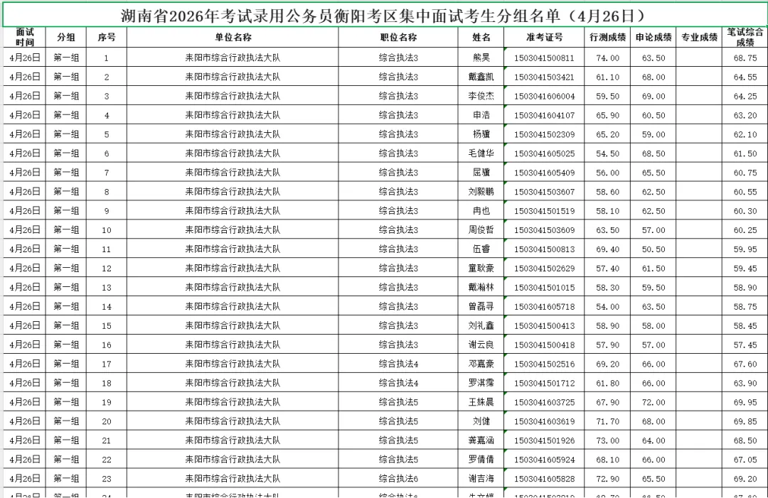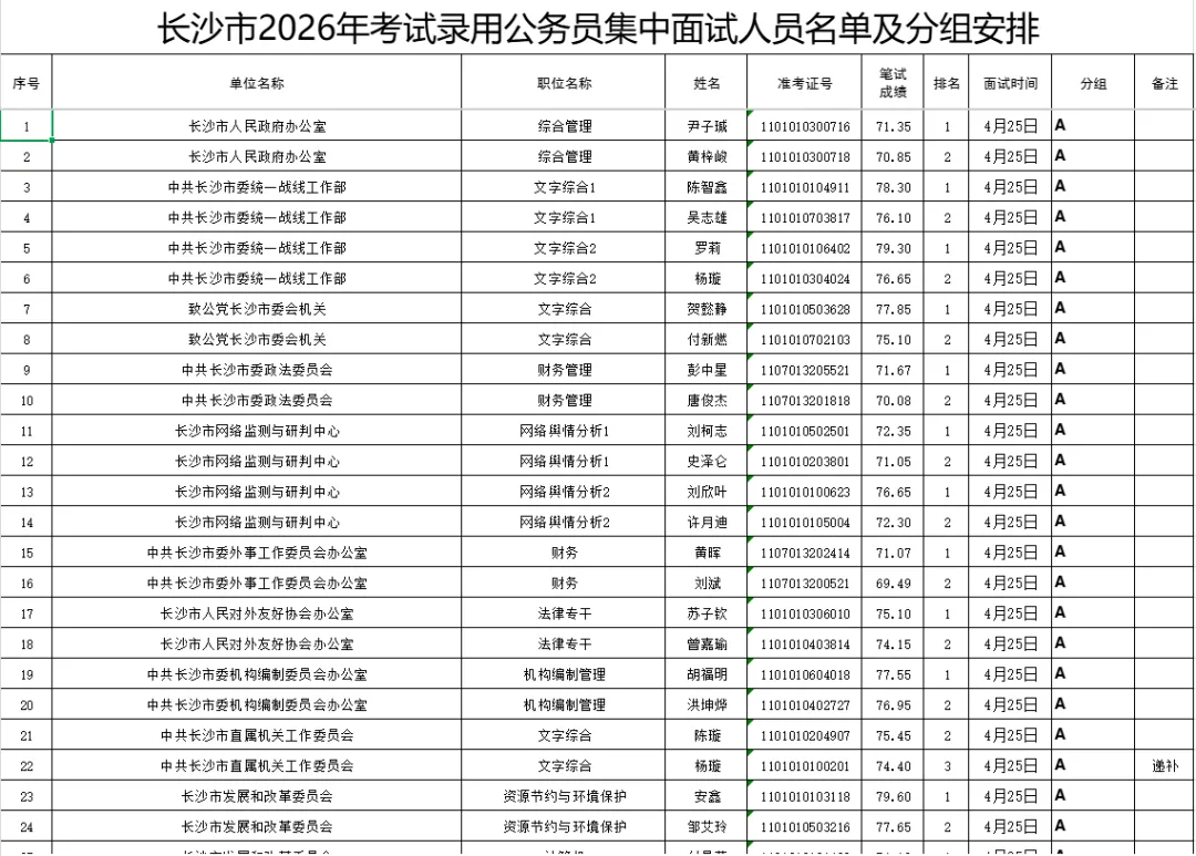 2026年(长沙市)考试录用公务员面试名单及分数.xlsx