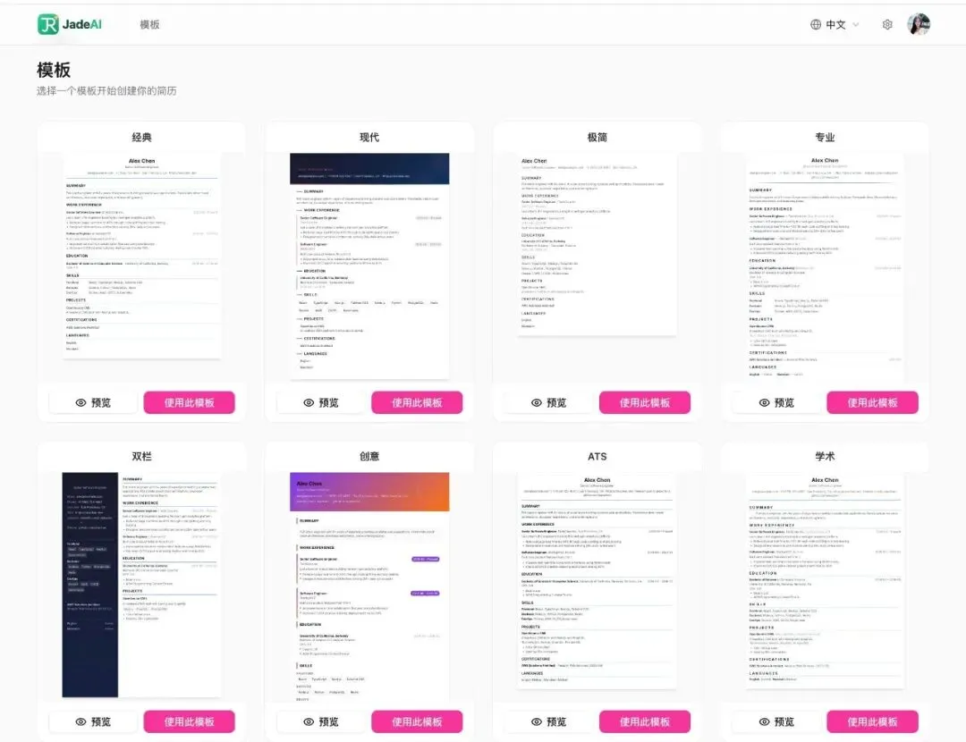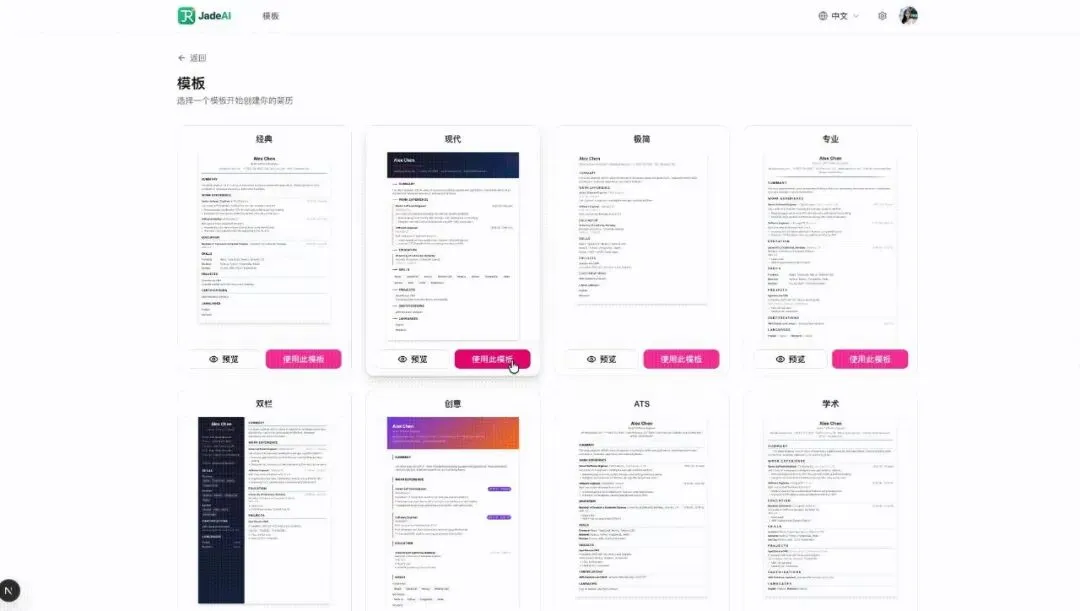 模板是简历的“门面”,JadeAI内置50+套经过专业设计的简历模板,告别千篇一律的粗糙设计,适配不同行业、求职场景与个人风格。