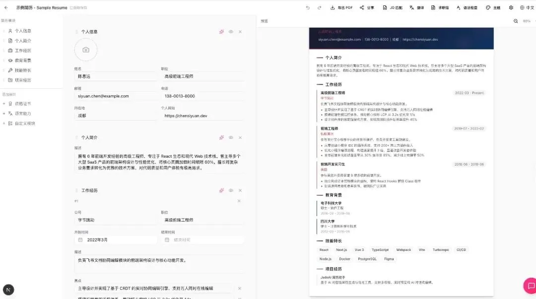 这种“开箱即用、灵活扩展”的部署设计,既适合个人用户本地部署使用,也能满足小团队内部搭建私有简历工具的需求,真正实现“我的数据我做主”。
