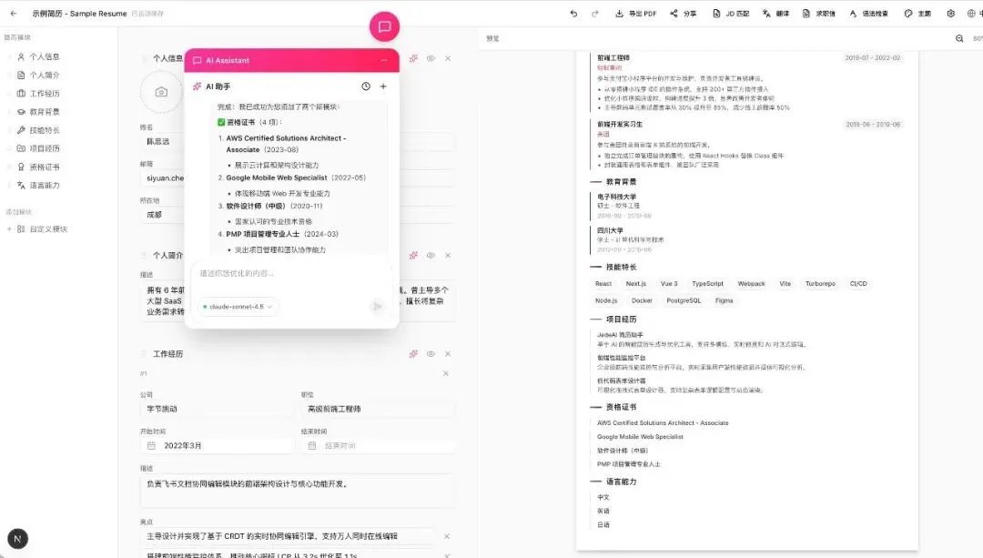 编辑器内集成AI聊天助手,支持多会话、历史记录持久化,可直接用自然语言与AI对话,针对性优化简历内容。