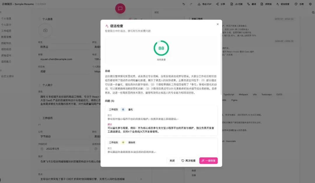 - 一键修复:支持批量应用修改建议,无需手动逐个调整,快速提升简历专业度。