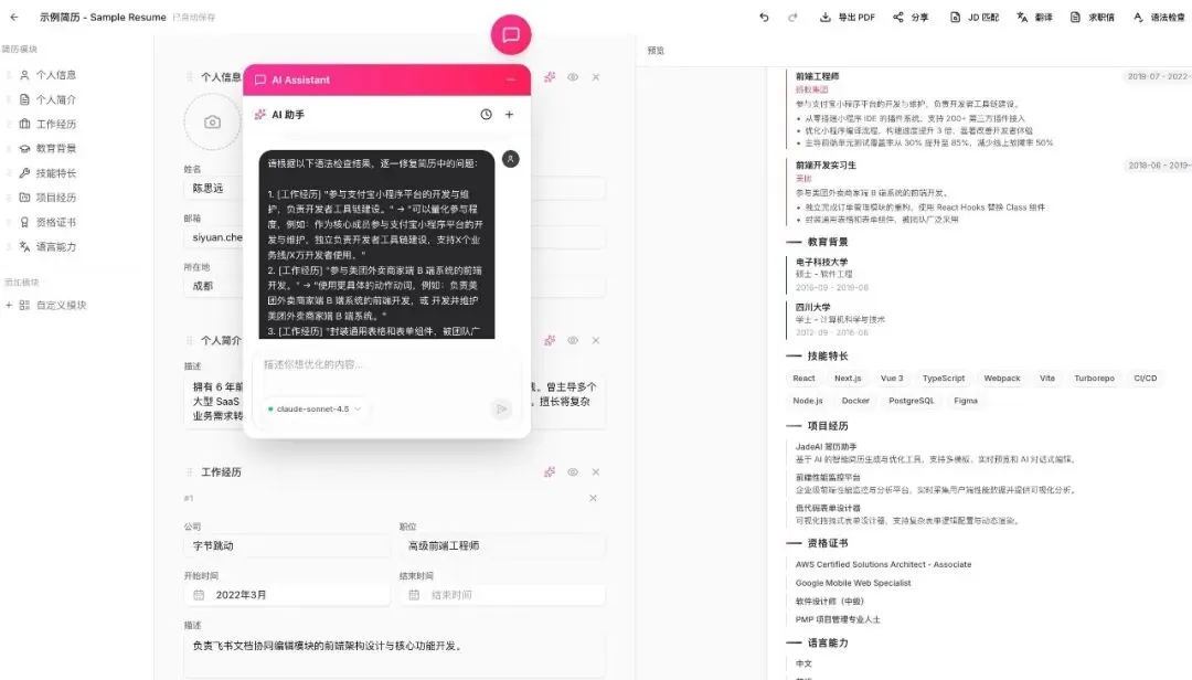 JadeAI的强大,不仅在于免费开源,更在于其功能全面性与AI智能化程度,从模板选择、可视化编辑,到AI生成优化、多格式导出,全流程覆盖简历制作的每一个环节,媲美甚至超越多数付费工具。