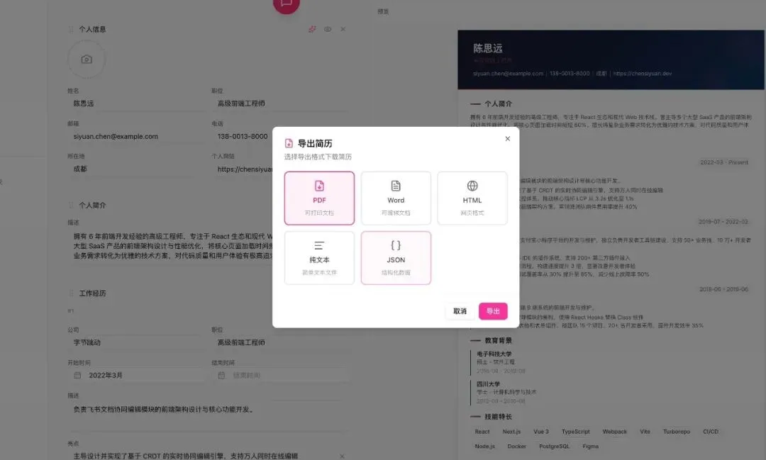 - 多格式导出:一键导出PDF(高清无水印,适配打印与线上投递)、DOCX(可二次编辑)、HTML(网页版简历)、TXT、JSON等格式;