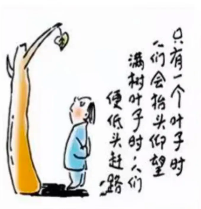 (注)漫画文字:只有一个叶子时,人们会抬头仰望;满树叶子时,人们便低头赶路。
