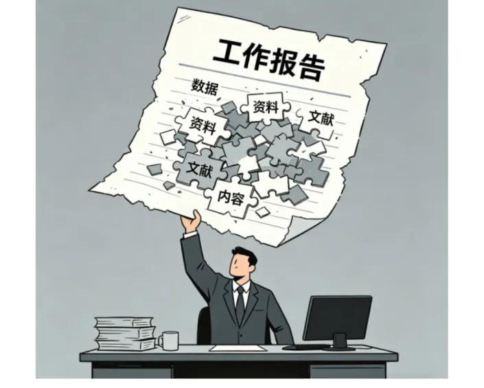 漫画题。画面中一名工作人员手持年终工作报告,报告上的数据、资料、文献、内容等,都是通过碎片化拼图拼接而成。请结合漫画内容,谈谈你的感悟。