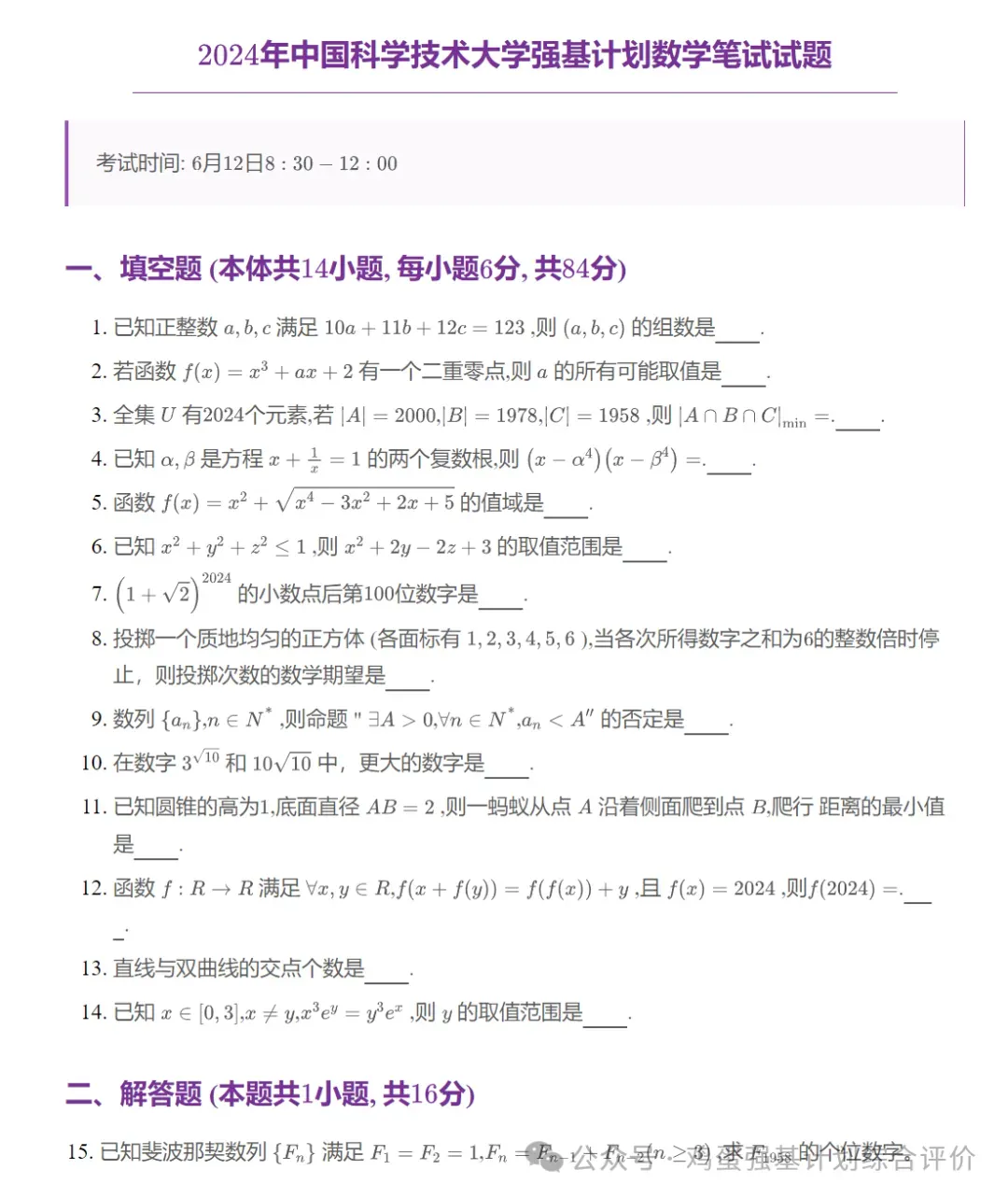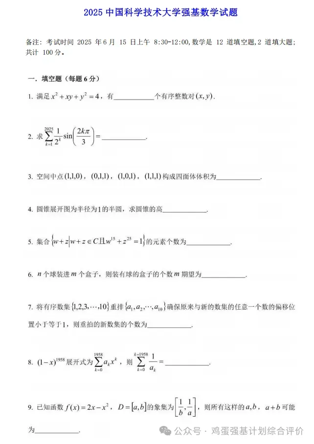 4、难度:数学难度与竞赛一试部分相近(不过每年的难度、题目形式及数量会略有差异),对于有数学竞赛基础的考生来说,60%以上的题目能够上手作答(不一定能完全做对),大部分题目都有解题思路。李同学此次数学考了78分,他表示这个分数略低于自己的预估,因为全程只有一道填空题未作答。