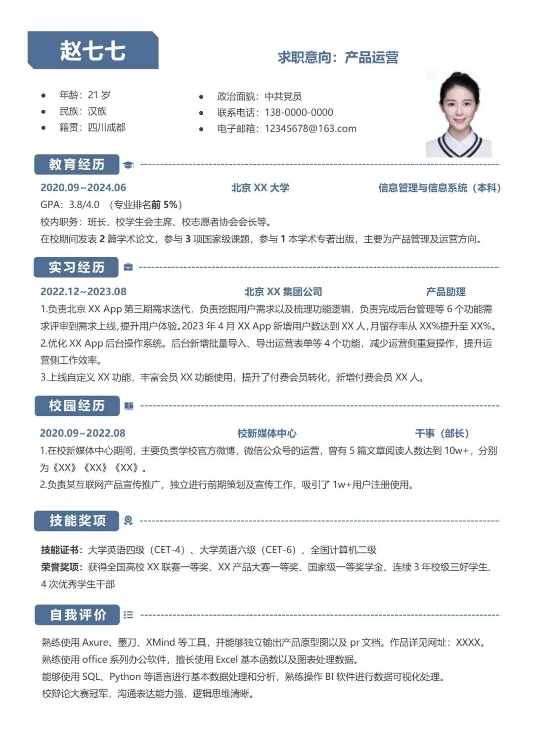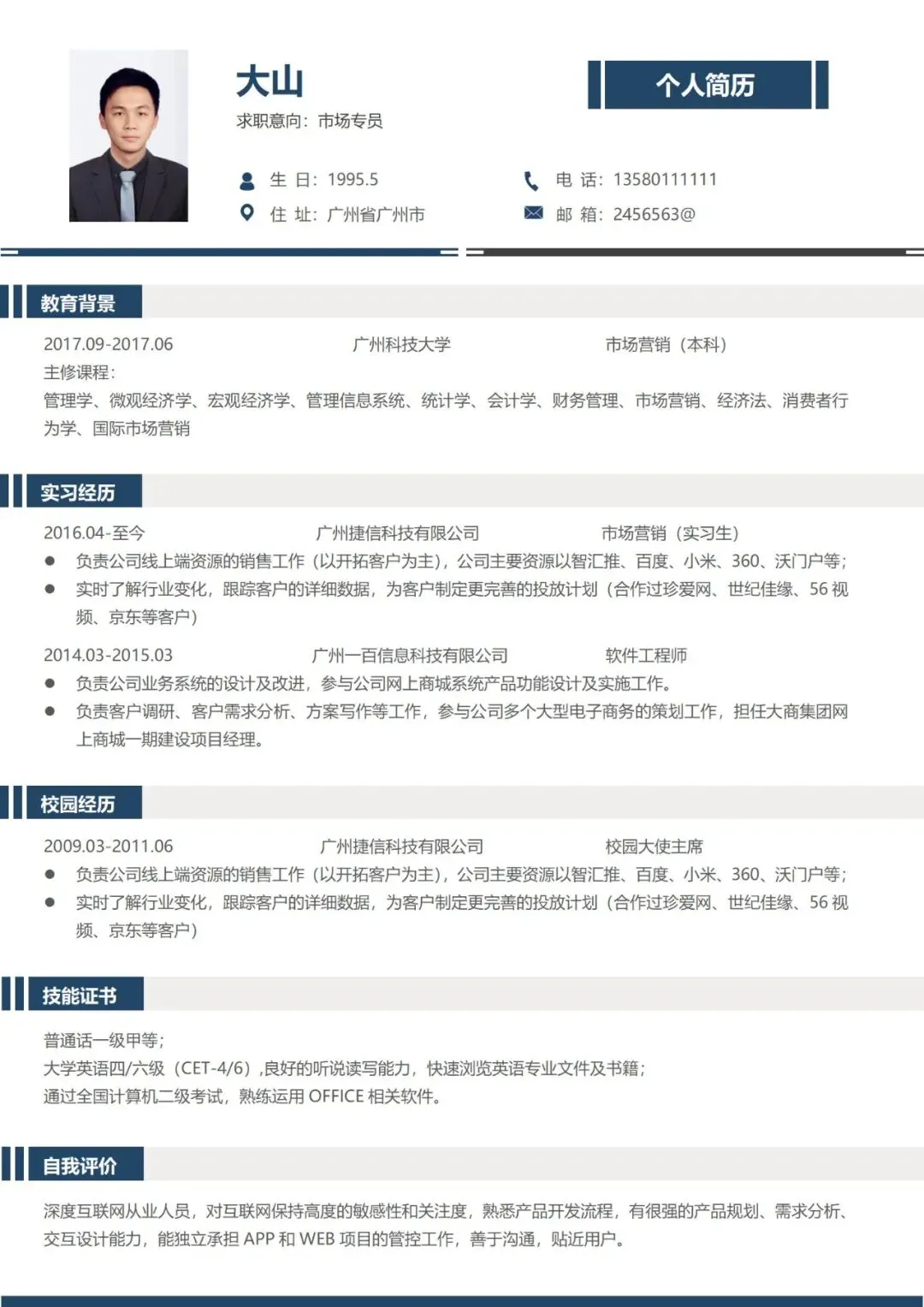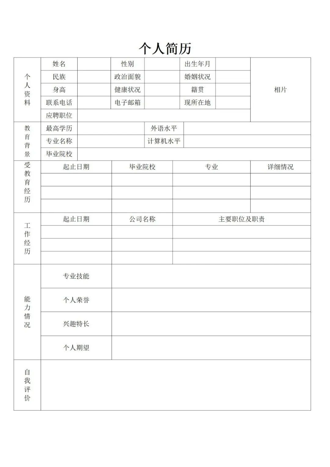 简历模板是规范求职履历的标准化文档框架,通过预设板块与排版,帮助求职者高效梳理个人信息、教育背景、工作经历等核心内容。常见模块包括基本信息、求职意向、技能特长、项目经验等,适配不同行业与设计风格(如商务简约、创意设计、学术科研等)。优质模板注重逻辑层级清晰、重点信息突出,兼顾阅读体验与专业度,可大幅降低排版成本,让HR快速抓取关键信息,是职场人提升简历竞争力的实用工具。
